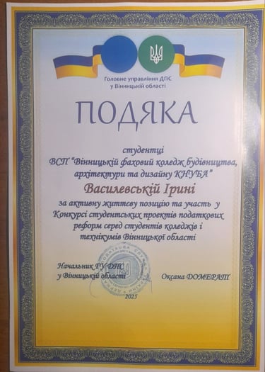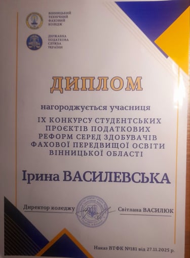 На конкурсі студентських робіт з податкових реформ ВФКБАД КНУБА гідно представила студентка 3-го курсу спеціальності 076 «Підприємництво та торгівля» освітньо-професійної програми «Бізнес-технології та рекламна діяльність» Василевська Ірина Вадимівна з актуальною та глибоко опрацьованою конкурсною роботою на тему: «Впровадження податку на виведений капітал у повоєнній Україні».