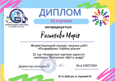 ІІІ місце у номінації «Віртуальні обрії у цифрі» здобула Романова Марія (47Д-1), представивши актуальне цифрове бачення простору та форми (керівник Пелешко О.П.).