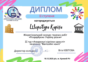 ІІ місце у номінації «Фантазійні хвилі» - Шоробура Каріна (47Д-2) - (керівник Сидоренко О.Д.).