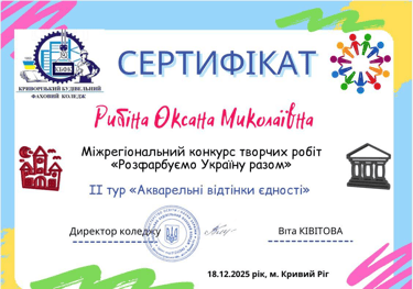Сертифікат учасника отримала також студентка групи 27Д-2 Рибіна Оксана.
